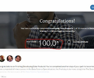 오늘 수료했지만 인증수료증이 아니라서 Signature Track이 안 채워졌던 Developing Data Products를 100점으로 수료하였고, 가장 어려워서 포기하고 싶었는데 끝까지 노력해 R Programming을 수료하였다. 그리고 지금까지 시간이 없어 못 딴 The Data Scientist's Toolbox도 30분만에 수료하였다.